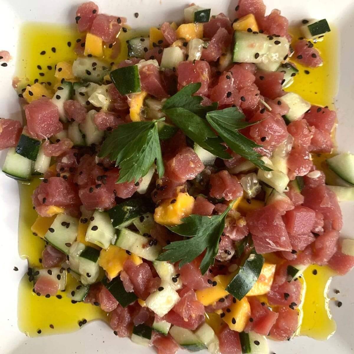 Delicioso tiradito de atún bañado en la salsa de la casa, acompañado de peino y cebolla morada montado en una cama de tostitos.