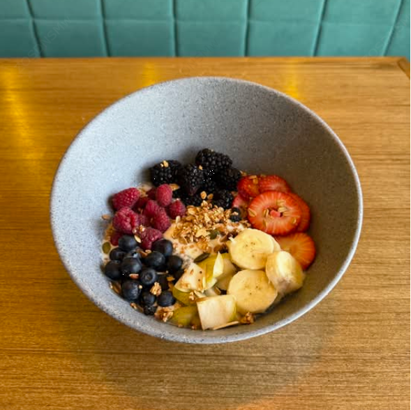 Chía hidratada con leche de coco topping de blueberry, fresa, plátano, pera, frambuesa y zarzamora, mezclado con yogurt cero azúcar y granola.
