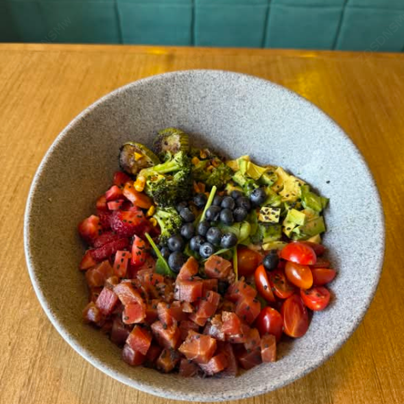 Bowl atún (100 g), acompañado con arroz de base, fresa, cherry, aguacate, blueberry, verduras mixtas, espinaca y ajonjolí.