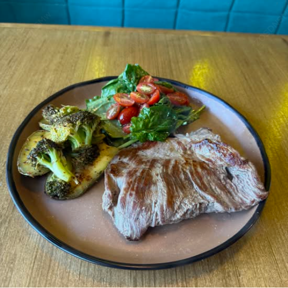 Corte de 120 g de arrachera, acompañado con verduras salteadas y ensalada de la casa.