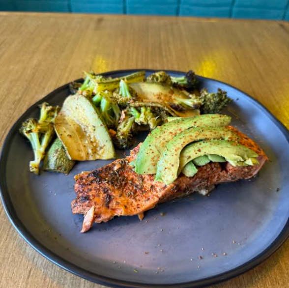 Salmón (150 g) sazonadas con especias italianas, y especias de la casa, limón y topping de aguacate y verduras variadas asadas.