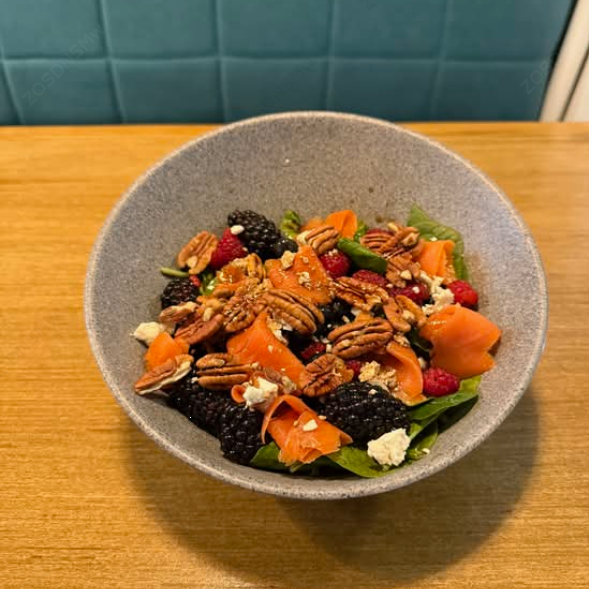 Salmón ahumado 60 g, acompañado con espinaca, frambuesa, zarzamora, blueberry, queso de cabra y nuez.
