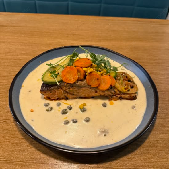 Salmón (150 g), con nuestra deliciosa salsa de alcaparra cremosa, topping, verduras salteadas y alcaparras enteras.