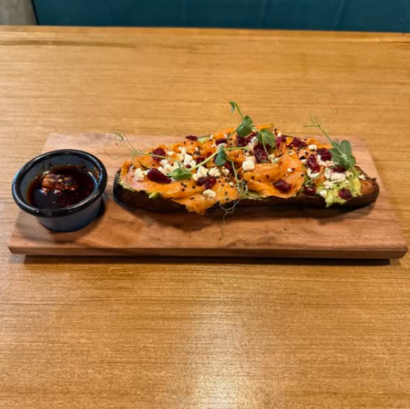 Toast de salmón, pan de hogaza, 60 g de salmón ahumado acompañado con arándano, queso de cabra, guacamole, brotes de chícharo comestible, ajonjolí y salsa matcha.