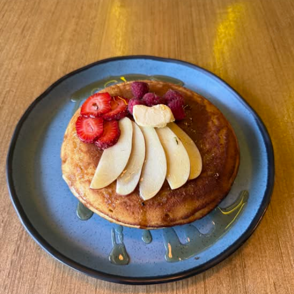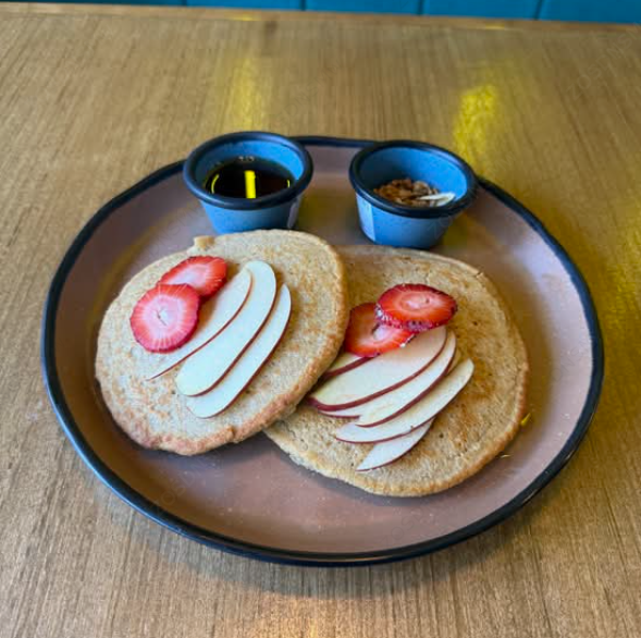 3 Hotcakes con harina de avena y almendra de la casa alta en proteína, topping fresa y manzana roja, endulzado con miel de agave.