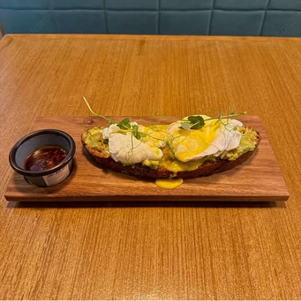 Toast de huevo pochado, pan de ogaza, 100 g de huevo, acompañado con salsa holandesa, guacamole, brotes de chícharo comestibles y salsa matcha.