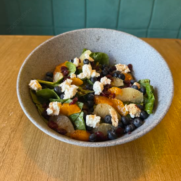 Acompañada con espinaca, queso ricotta, lima, mandarina, arándano y blueberry.
