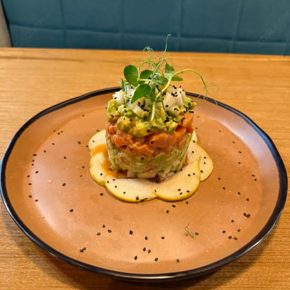 Tártara de salmón (100 g), acompañado con guacamole, pera, brotes de chícharo y ajonjolí.