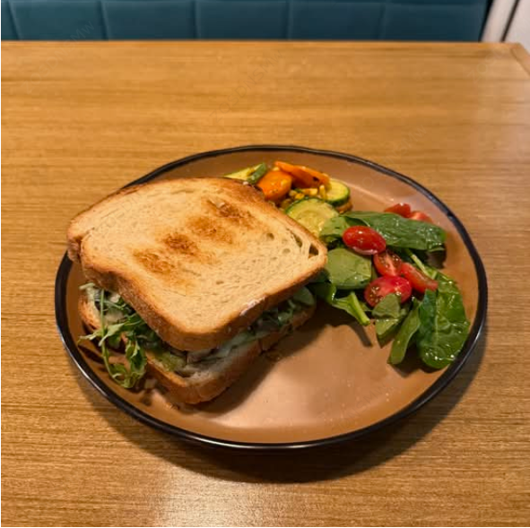 Pan de masa madre multigrano, 100 g de guiso de hongos, aderezo de cilantro, queso gouda, arúgula, acompañado con verduras cocidas y ensalada de espinaca.