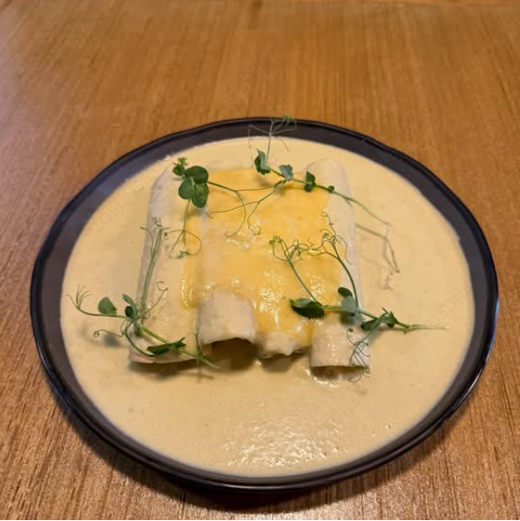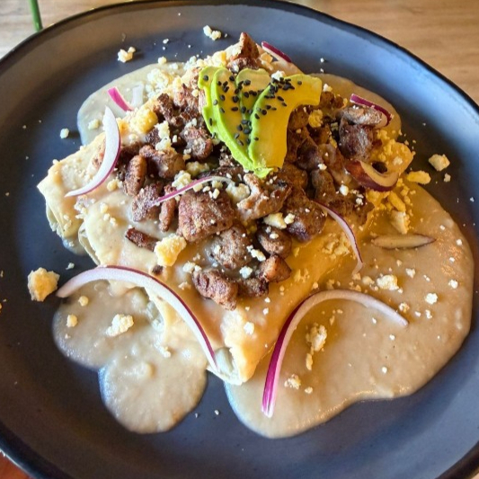 Deliciosas enfrijoladas rellenas de frijol y queso, acompañados con cebolla morada, aguacate y 100 gr de arrachera marinada
