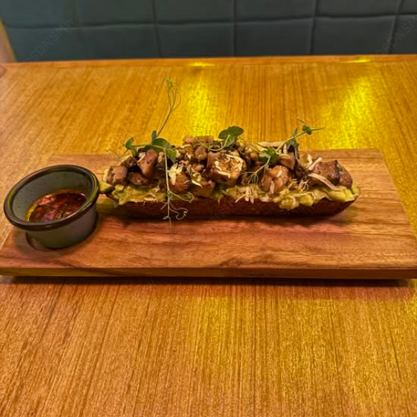 Toast de hongos, pan de hogaza, 100 g de hongos, acompañado con guacamole, queso parmesano, brotes de chícharos comestibles y salsa matcha.