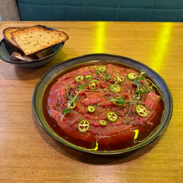 Sashimi atún (120 g) con pedacitos de chile serrano en nuestra salsa marinada, acompañado con pan al mojo de ajo.