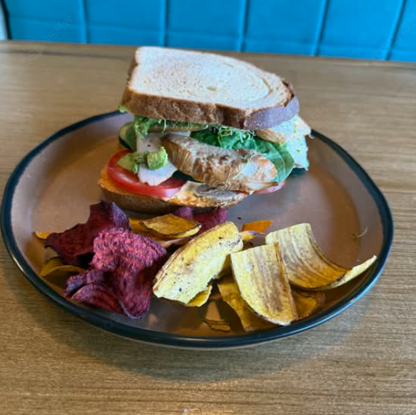 Pan de masa madre multigrano 80 g de pechuga de pavo, guacamole, aderezo chipotle, panela, espinacas, jitomate, pepino y germinado, acompañado de chips deshidratadas.