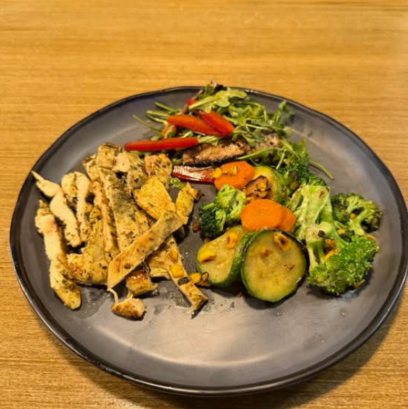 Pollo (120 g) sazonado con limón, orégano, marinado, acompañado de ensalada campestre de la casa y verduras variadas.