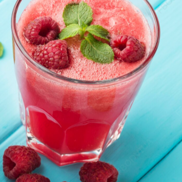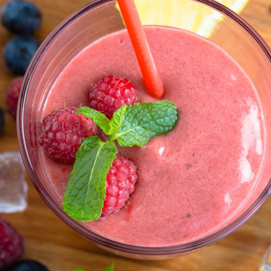 Elaborado con fresa y frambuesa, endulzado con estevia y hielo.