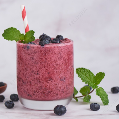 Elaborado con blueberry, zarzamora, plátano, endulzado con estevia y hielos.