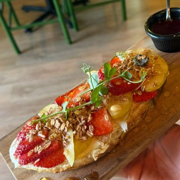 Toast de pera acompañada con pan de hogaza, pera, fresa, queso philadelphia, granola, brotes de chícharo y miel de agave.