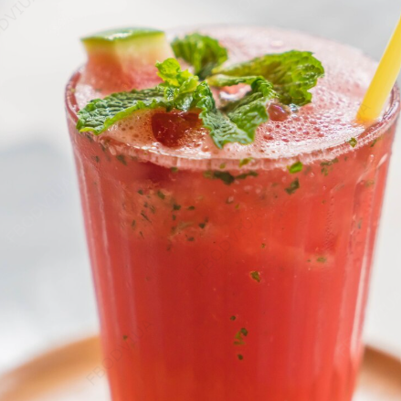 Elaborado con sandía, fresa, piña, espinaca, pasas, amaranto y leche.