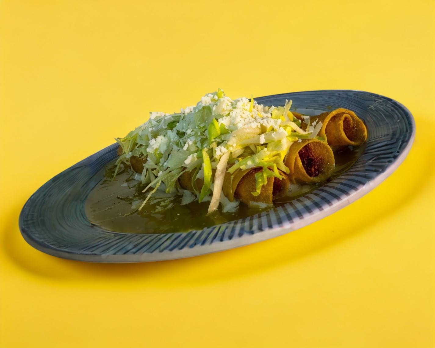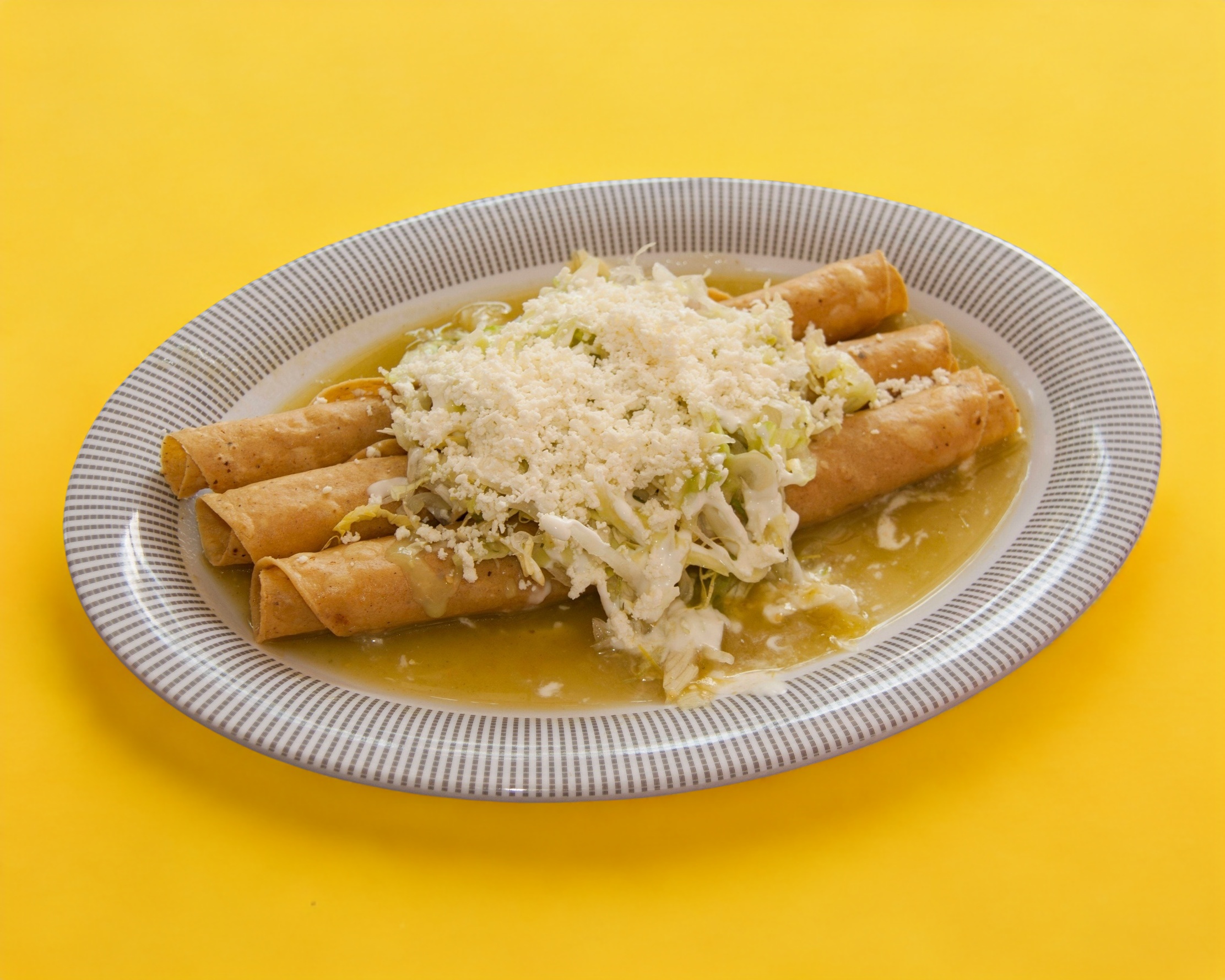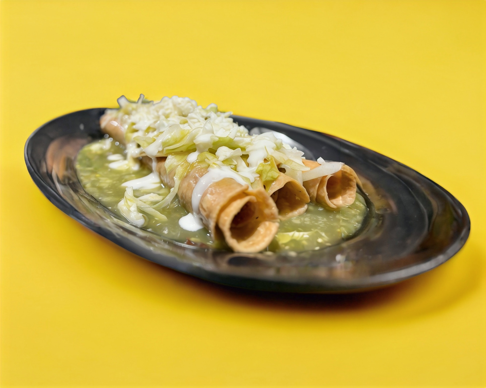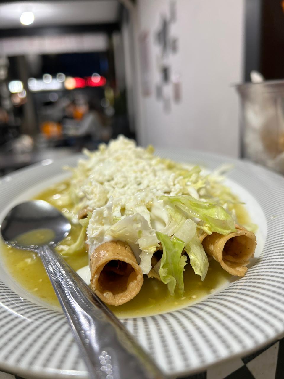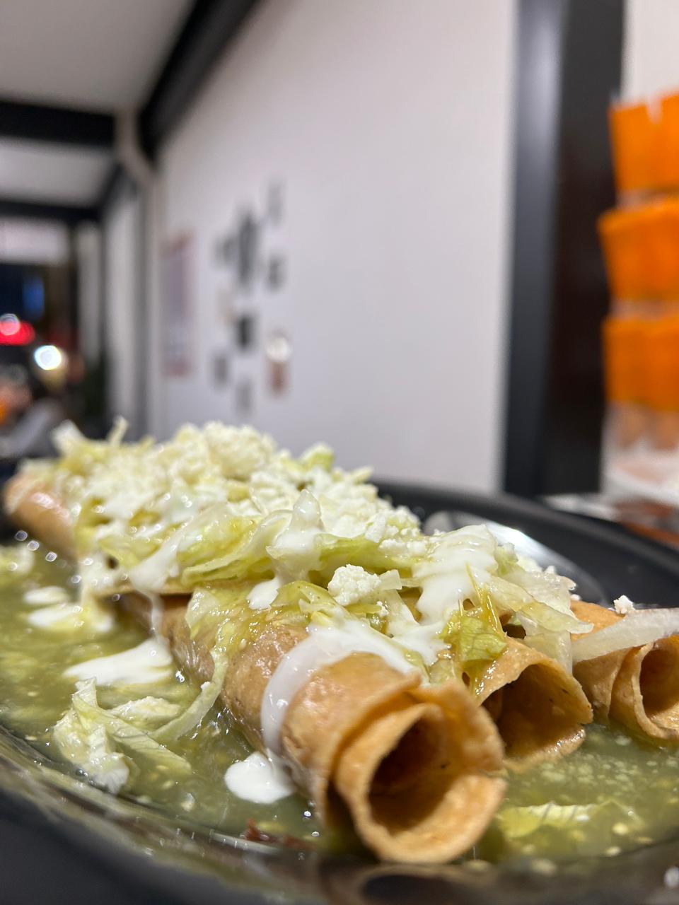 Flauta de Res preparada con guacamole, lechuga, crema y verduras separada proporcional incluye salsa verde (Porcion personal)