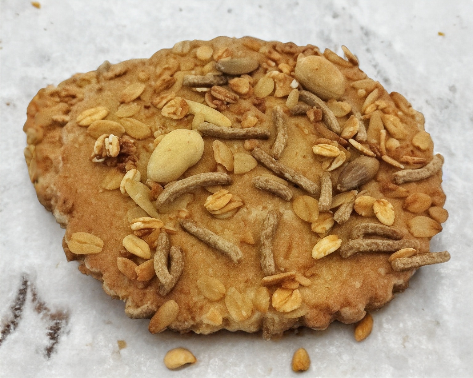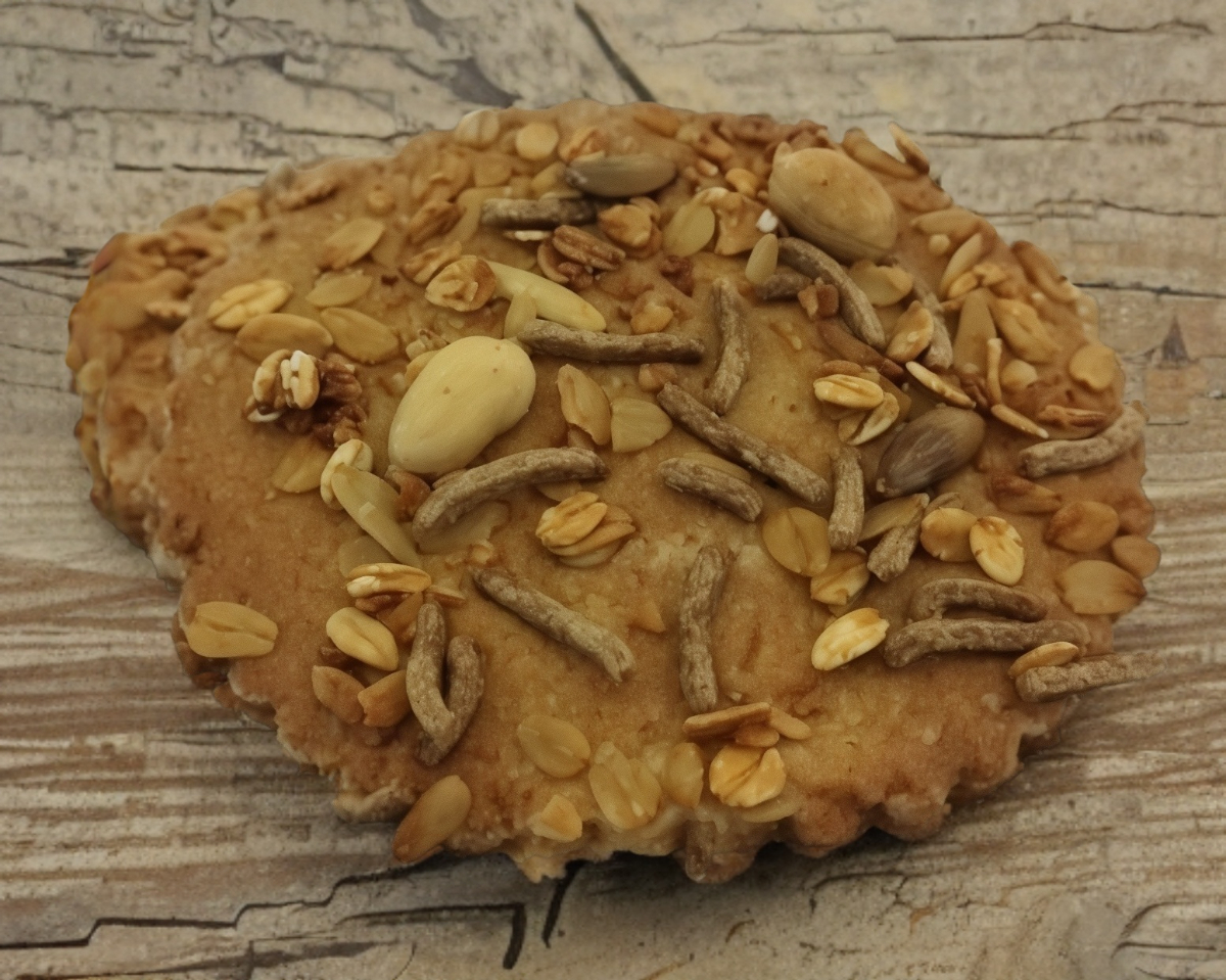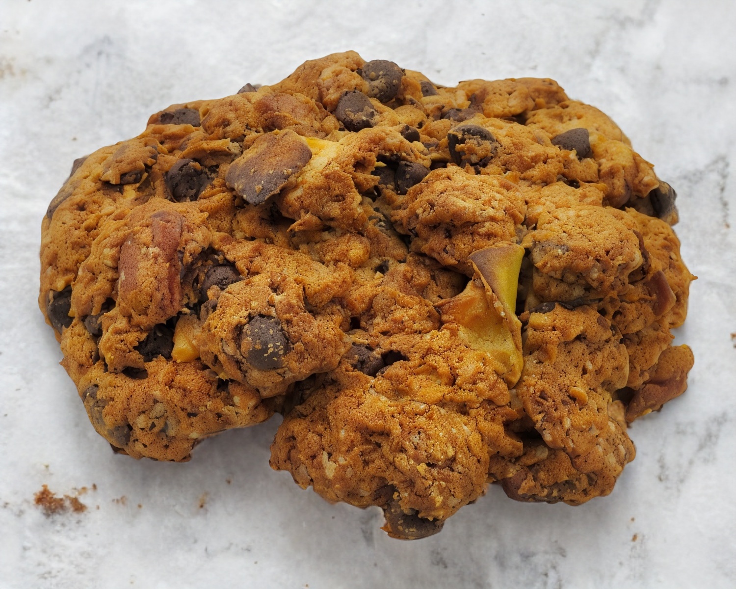 Masa de harina integral mezclada con platano, chispas de chocolate semiamargo, trozos de manzana verde y trozos de nuez pecana.