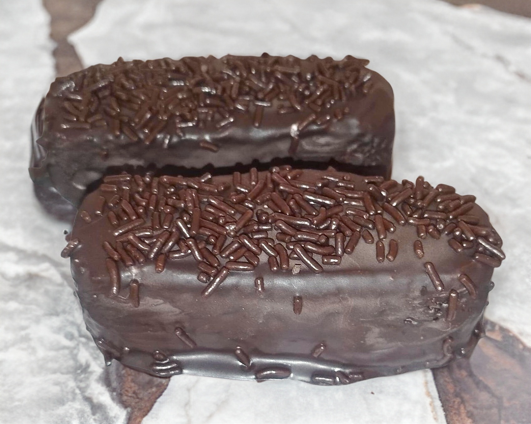 Pastelito con cubierta de chocolate semi amargo, con relleno de crema pastelera y mermelada