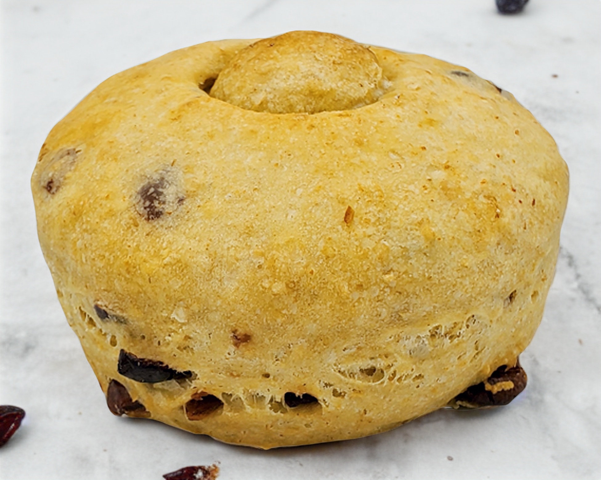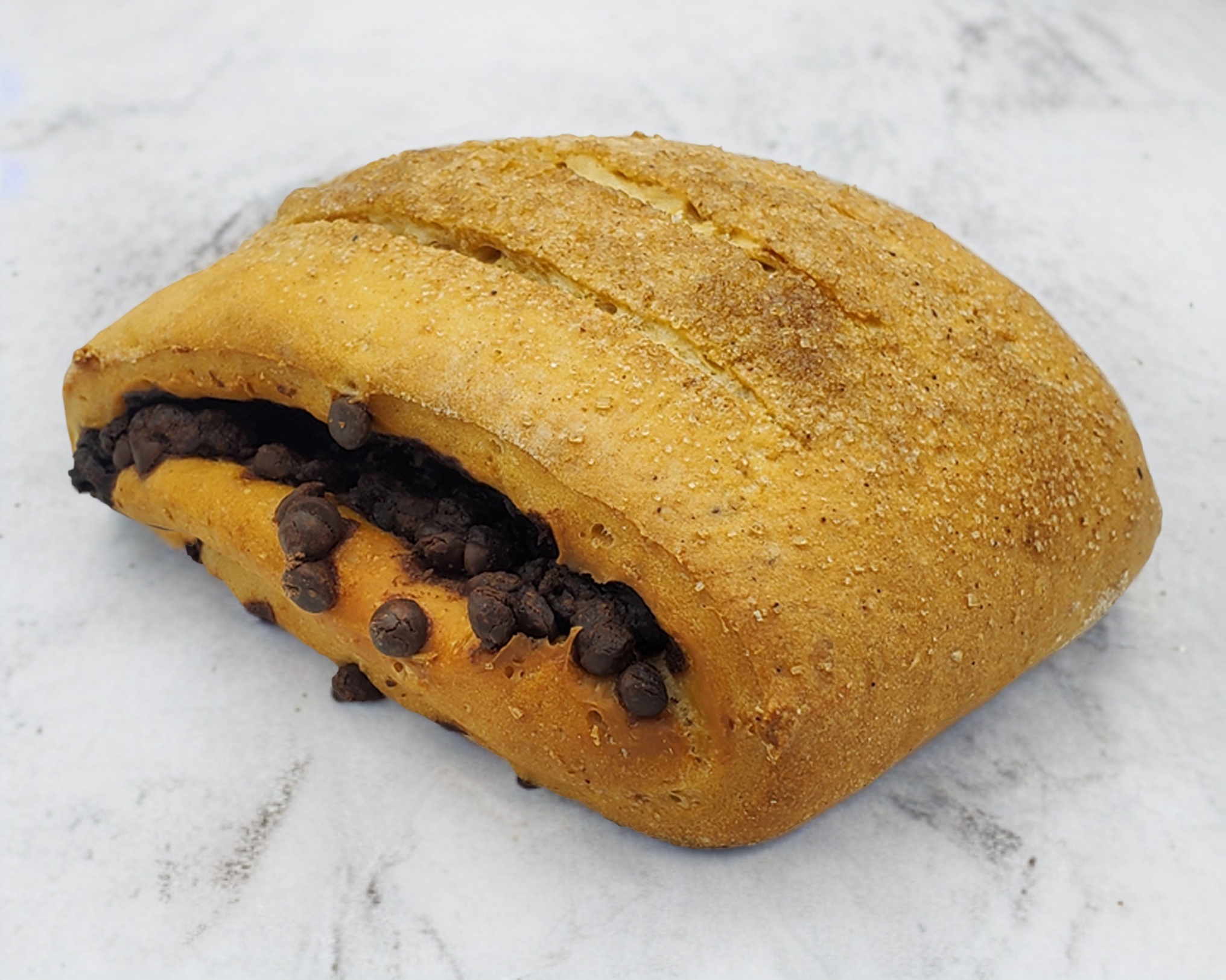 Relleno de chispas de chocolate semiamargo, el pan hecho con harina integral, masa madre, endulzado con miel de piloncillo y espolvoreado con azúcar mascabado.