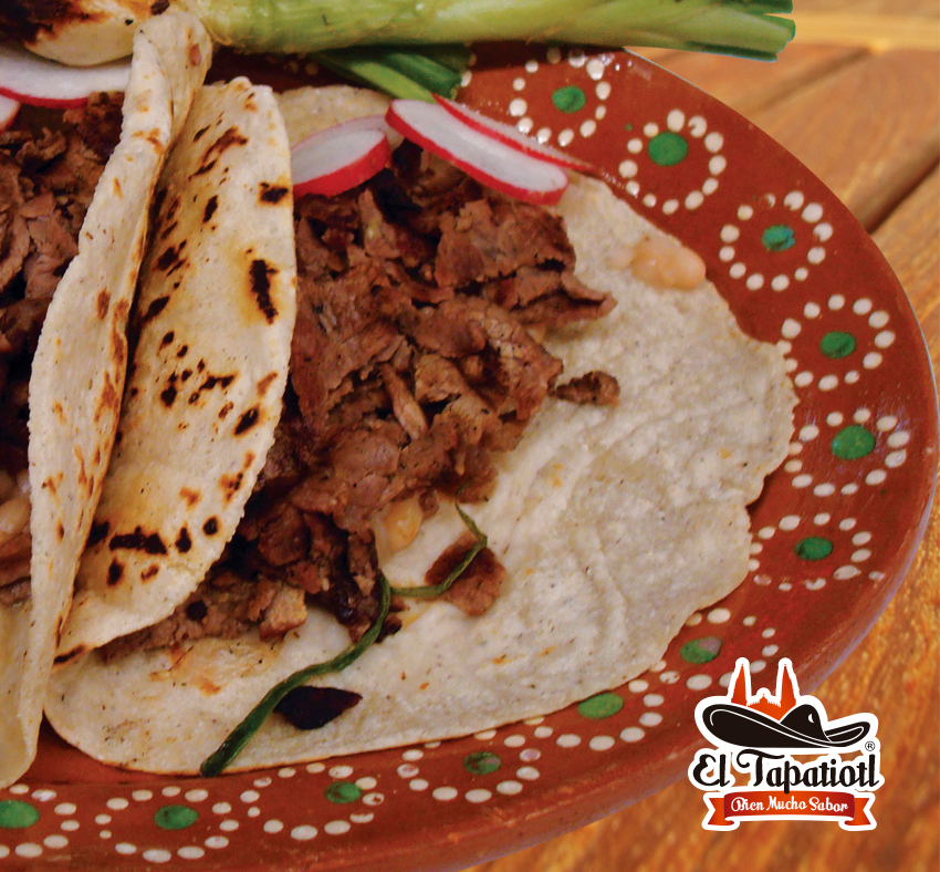En tortilla grande recién hecha en nuestro comal. 75 gramos de queso adobera regional típico de Jalisco. 50 gramos de bistec de res asado.