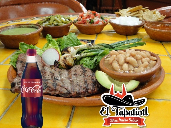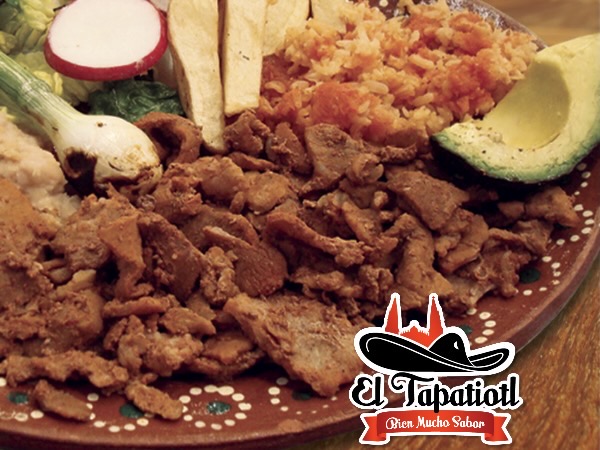 Platillo acompañado de frijoles de la olla, lechuga, rábanos, cebollitas asadas, aguacate, arroz y papas fritas rebanadas. Tortillas hechas a mano. 165 gramos de bistec de res (en crudo)