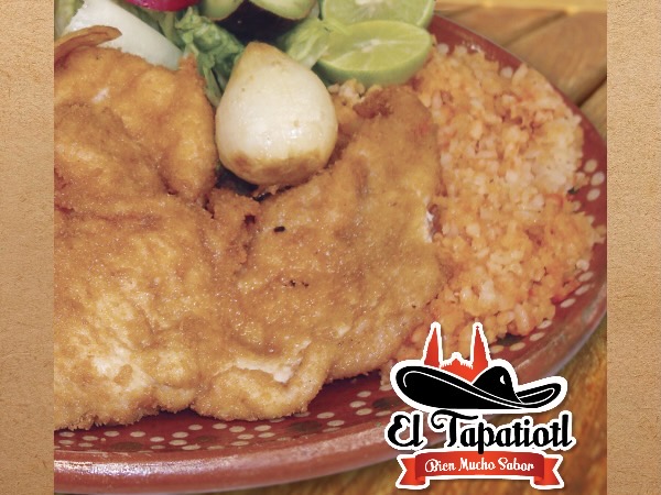 Platillo acompañado de frijoles fritos, lechuga, rábanos, cebollitas asadas, aguacate, arroz y papas fritas rebanadas. Tortillas hechas a mano. 160 g de Filete de pollo empanizado.