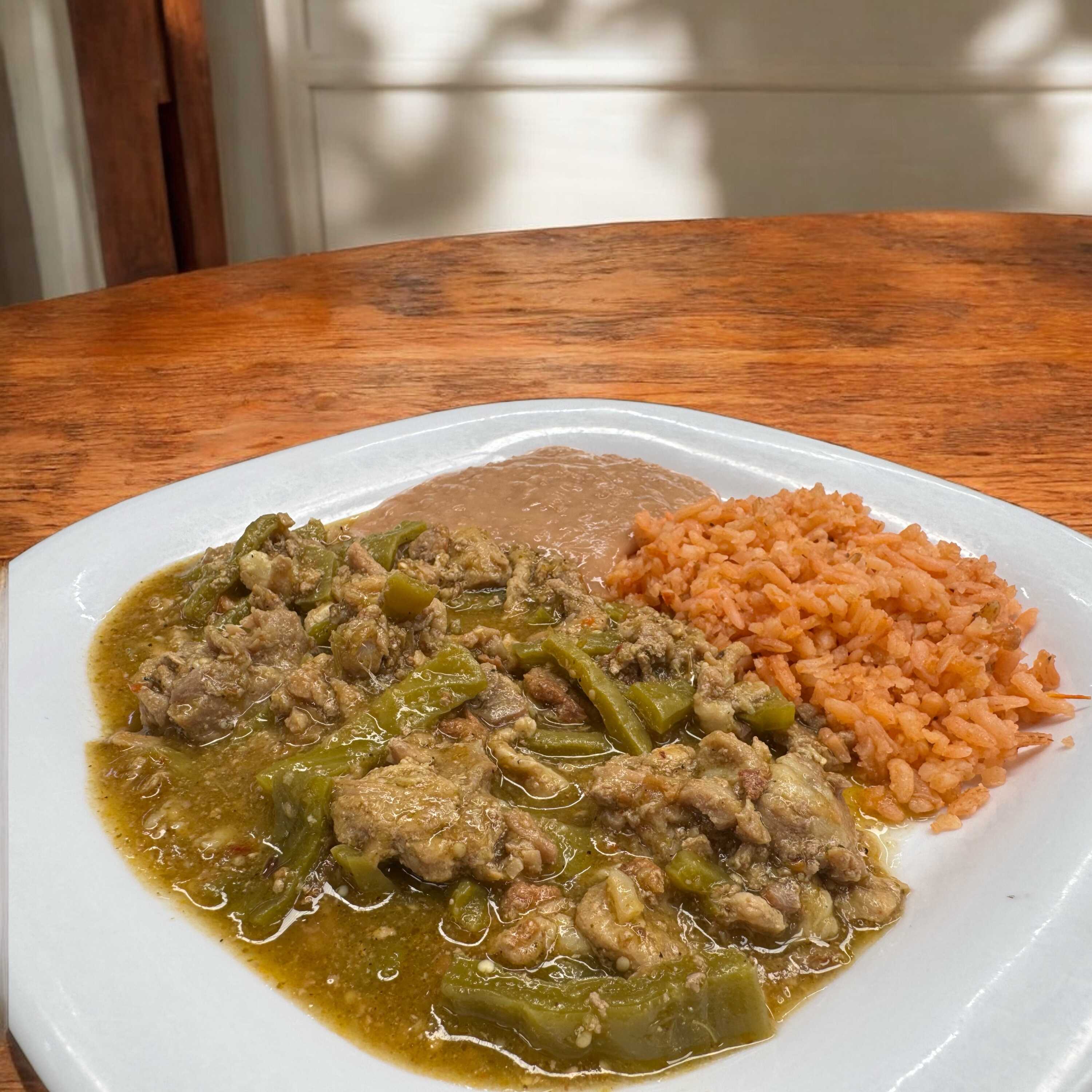 Arroz, frijoles fritos, tortillas hechas a mano y salsas de mesa. 250 gramos de guisado de bistec con nopales en salsa. Contiene carne de puerco.