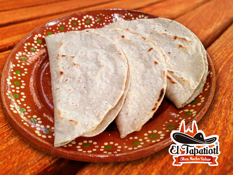 En tortilla grande recién hecha en nuestro comal. 75 gramos de queso adobera regional típico de Jalisco. 50 gramos de carne de cerdo adobada.
