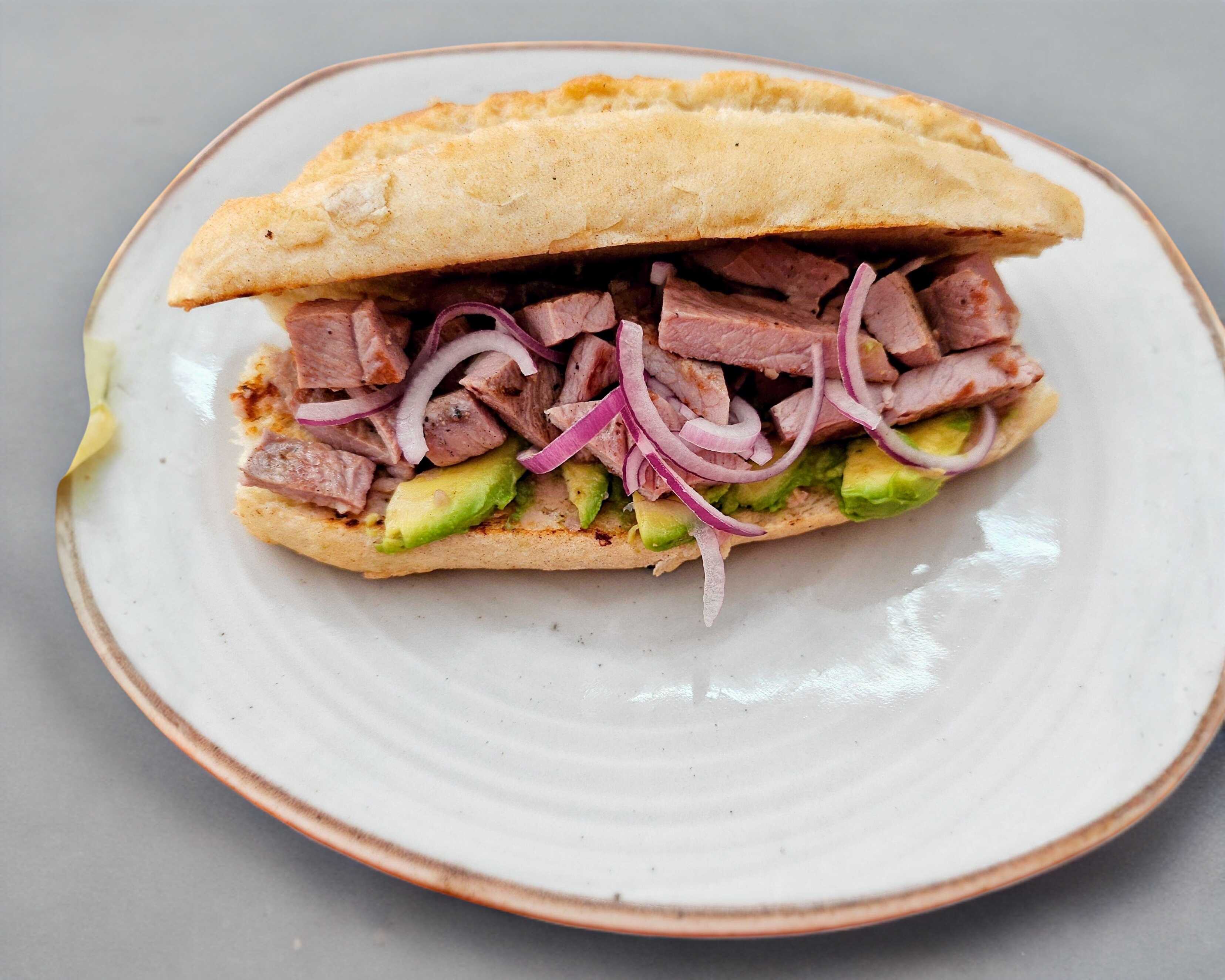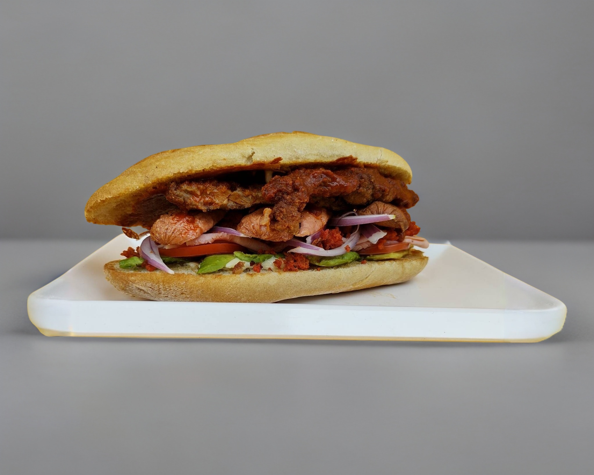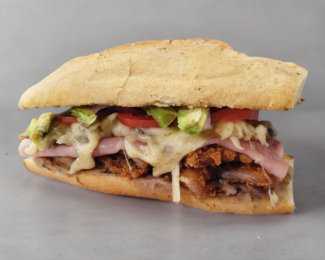 Frijoles refritos, milanesa, jamón, queso oaxaca ,aguacate, jitomate y cebolla morada