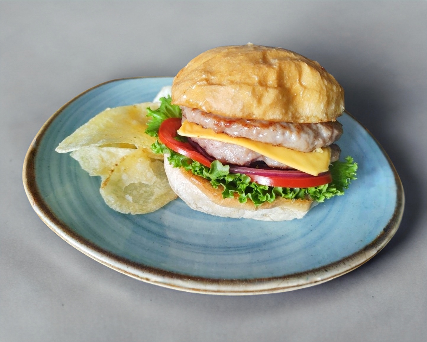 Disco de res, queso americano, lechuga, jitomate y cebolla morada acompañado de guarnición papas doradas