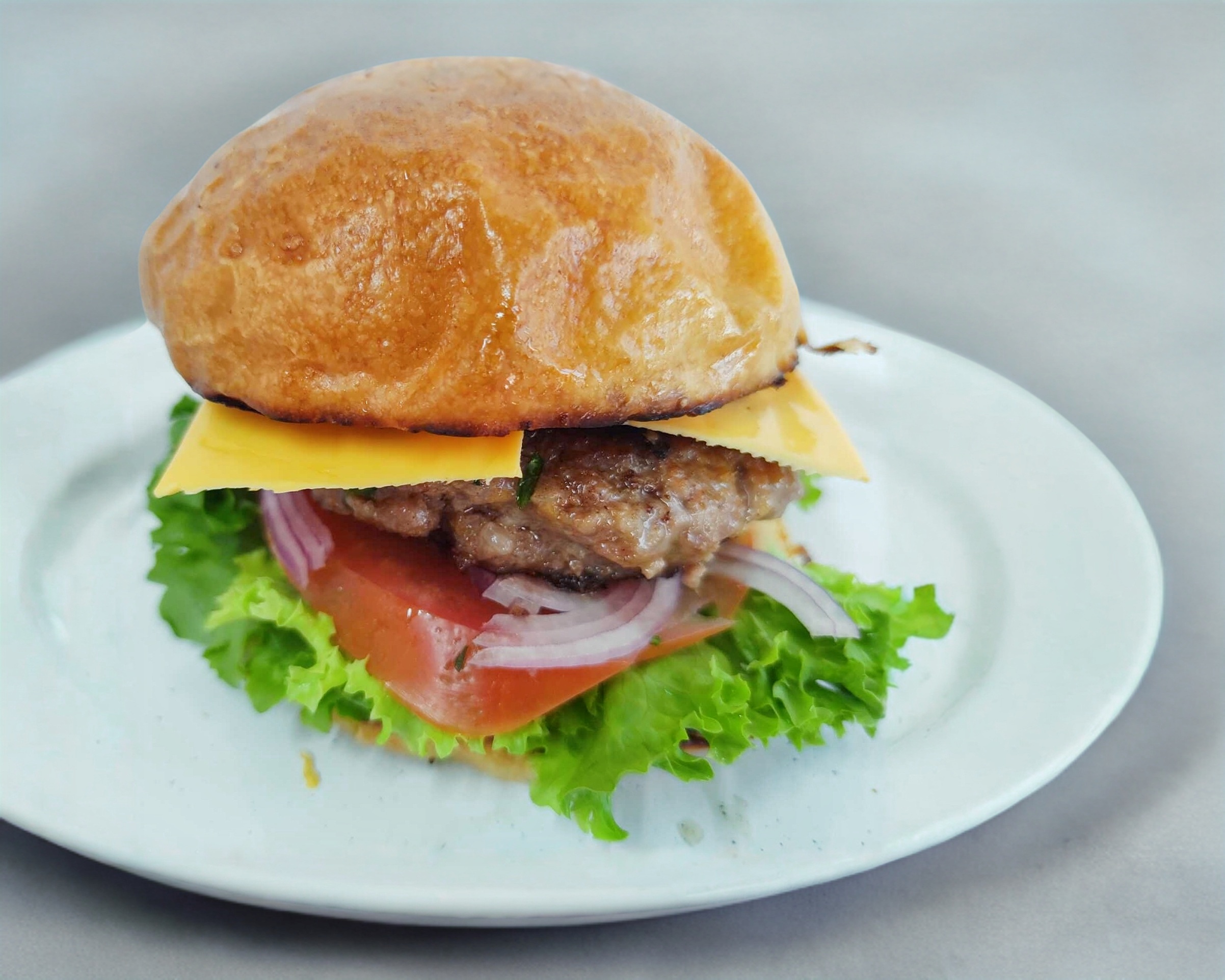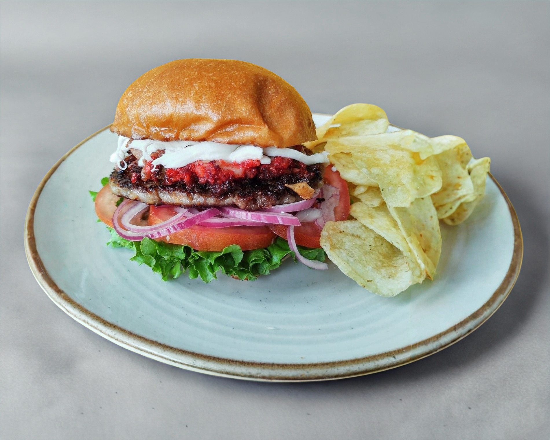 Pan brioche, carne de res, chorizo con queso Oaxaca, lechuga, jitomate, cebolla morada con guarnicion de papas doradas y aderezo