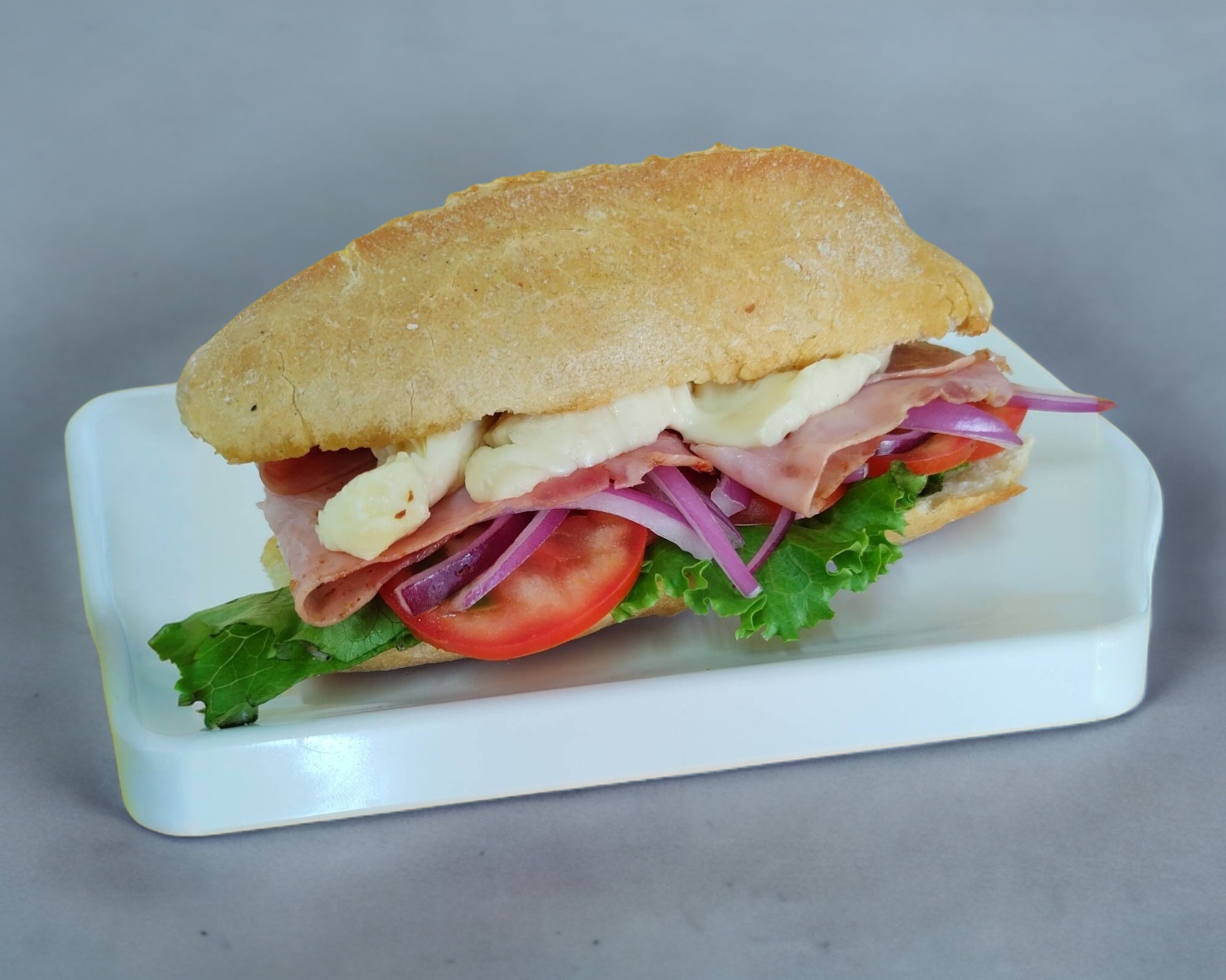 Jamon y panela lechuga,jitomate, cebolla morada, crema , catsup y mostaza