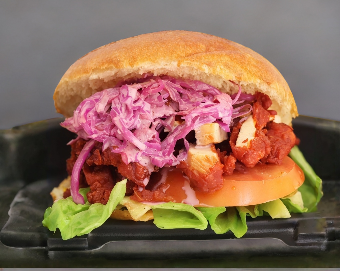 Bollo brioche, pollo frito con BBQ, lechuga, jitomate, cebolla morada y ensalada coleslaw acompañada de papas doradas