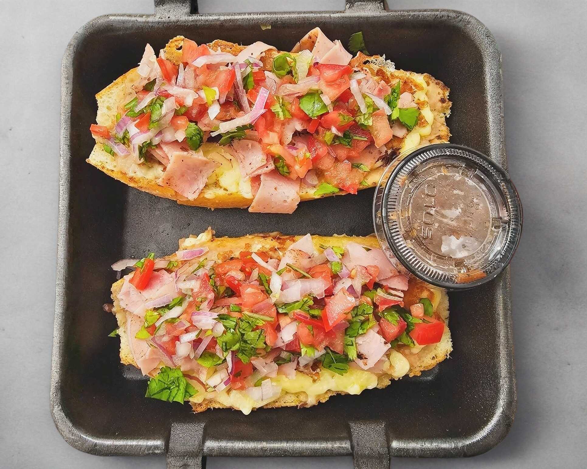 Molletes a elegir, frijoles refritos,queso,salsa mexicana y picante
