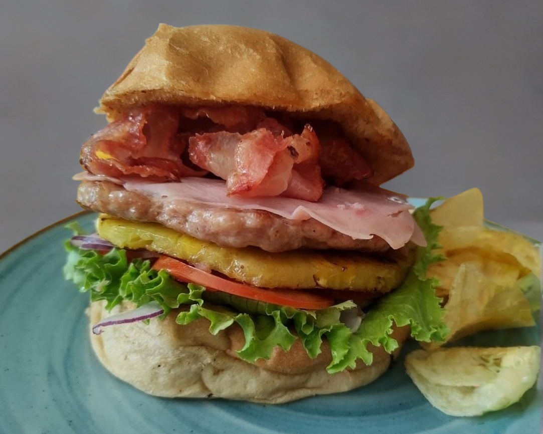 Bollo brioche,carne de res, piña, jamon, tocino,queso amarillo, lechuga, jitomate, cebolla morada, acompañada de papas doradas