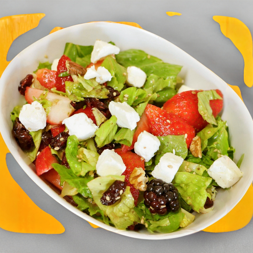 Fresco mix de lechugas y frutos del bosque. Fresa, frambuesa, zarzamora y arándanos, coronada con nuez y queso de cabra.