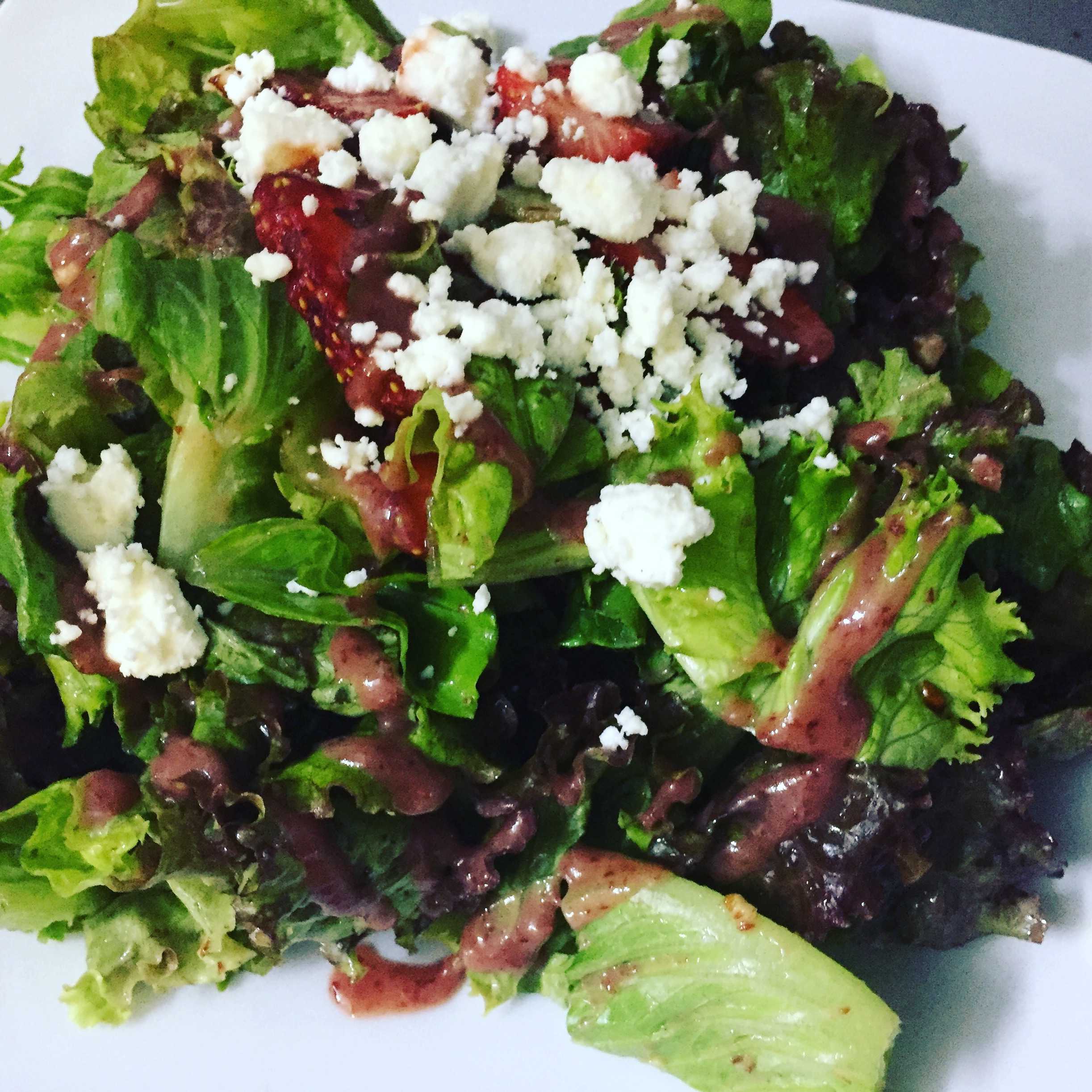 Lechugas mixtas, fresas, ajonjolí caramelizado, vinagreta arándano y queso de cabra.
