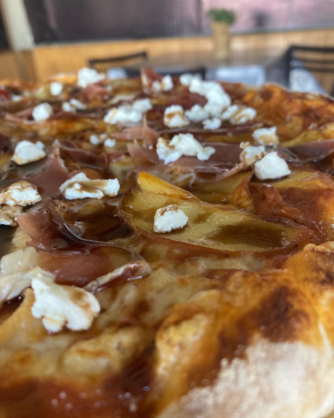 Jamon serrano, rebanadas de durazno natural, queso de cabra y balsamico