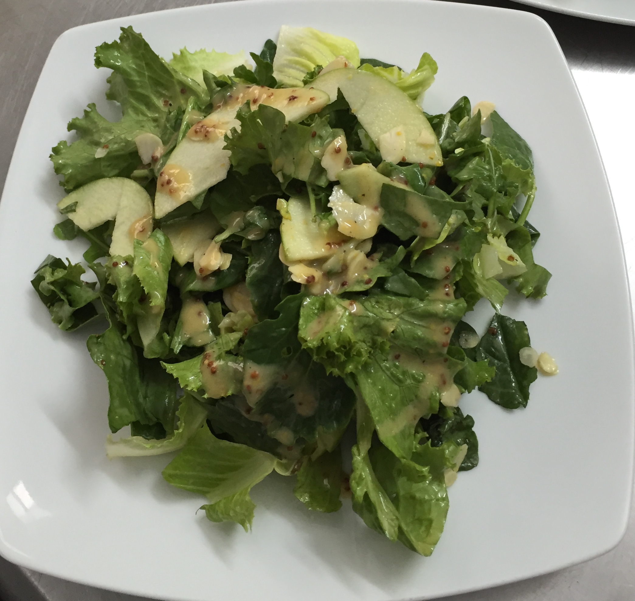 Lechugas, manzana verde, almendra, vinagreta miel-mostaza