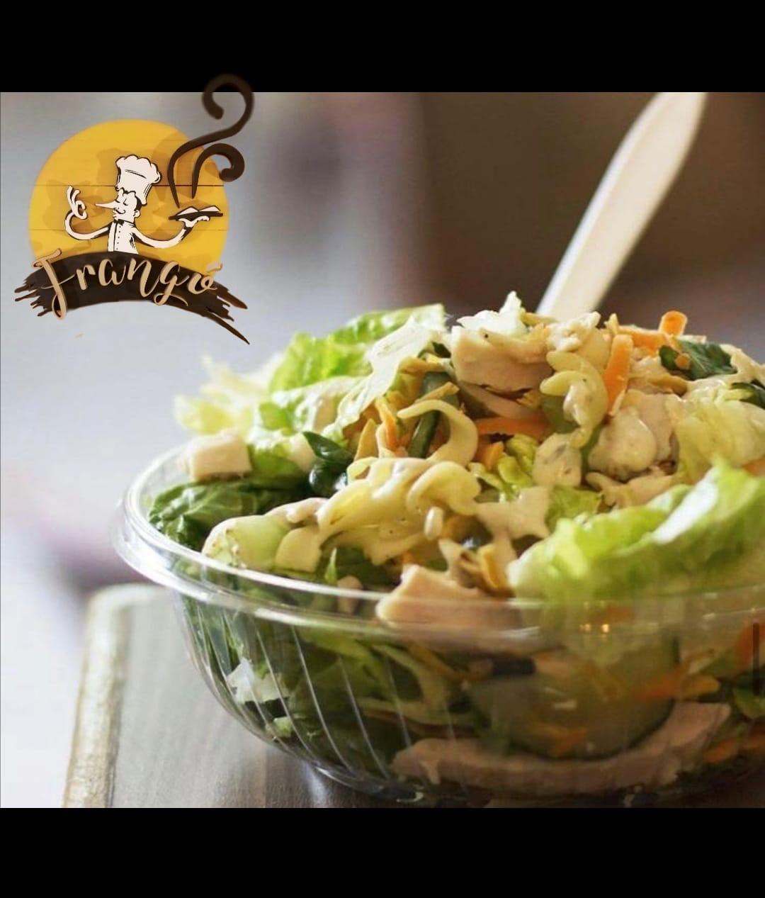 Lechuga, pepino, zanahoria, pollo a la plancha, crotones y queso parmesano.