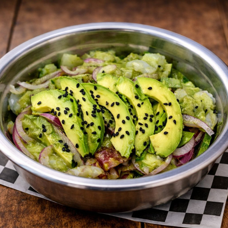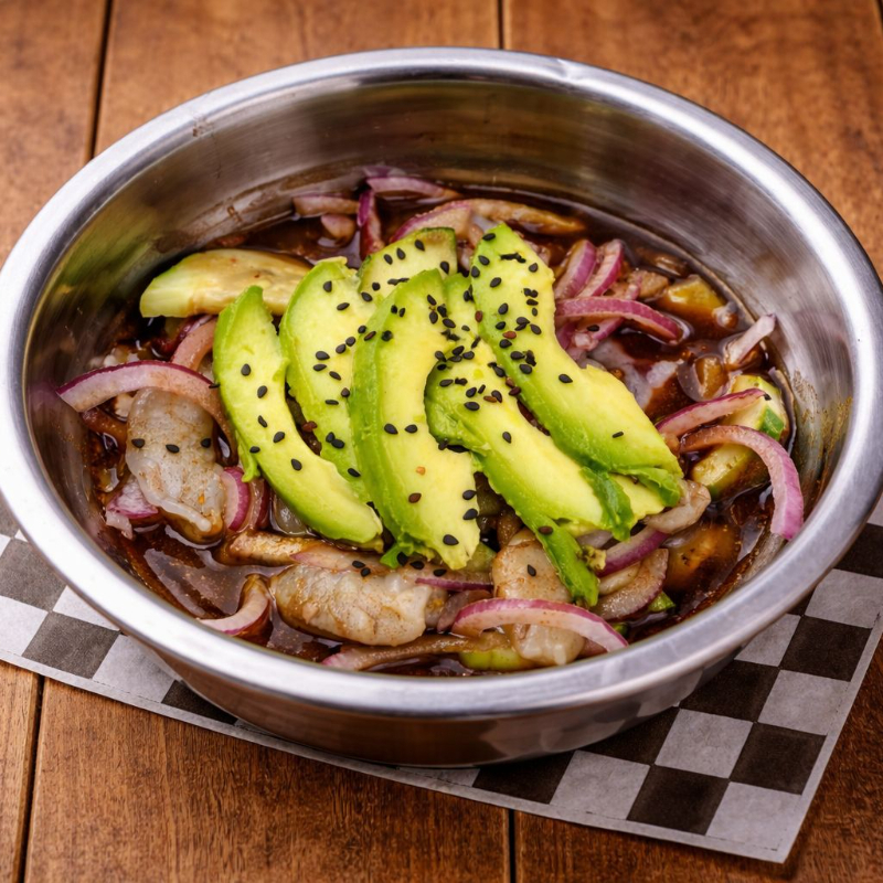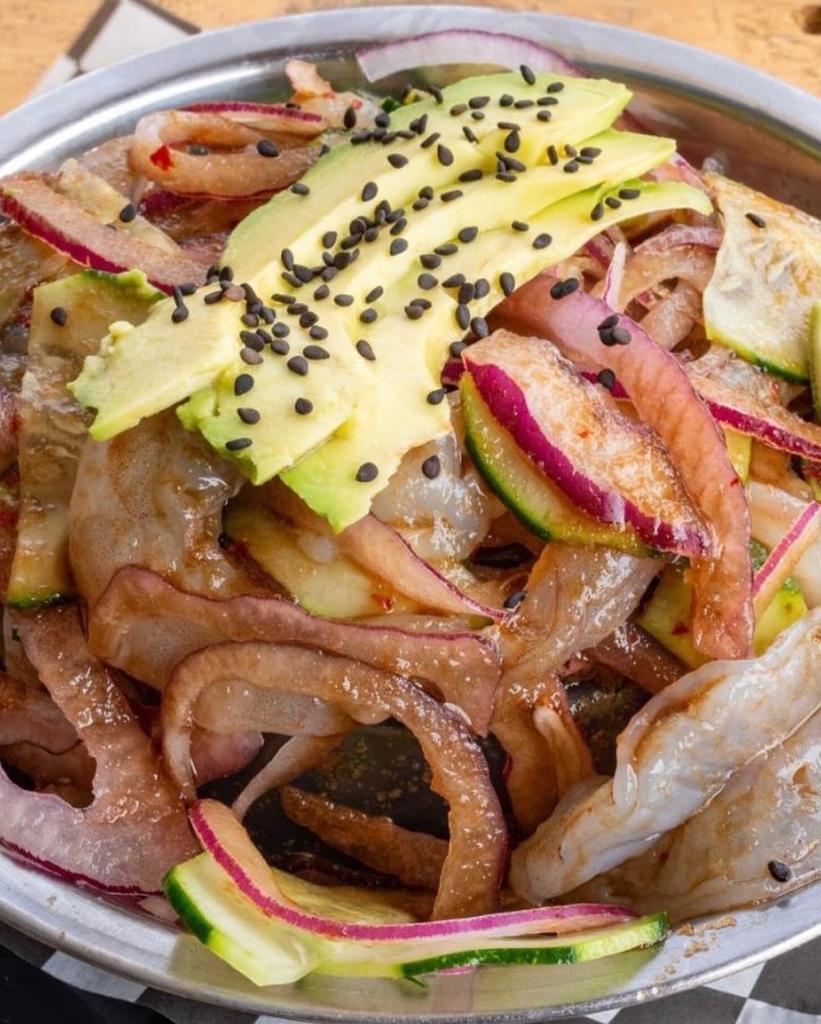 Camaron cocido, camaron crudo, pulpo y atún fresco con salsas de la casa, cebolla, chile cerrano y chiltepin.