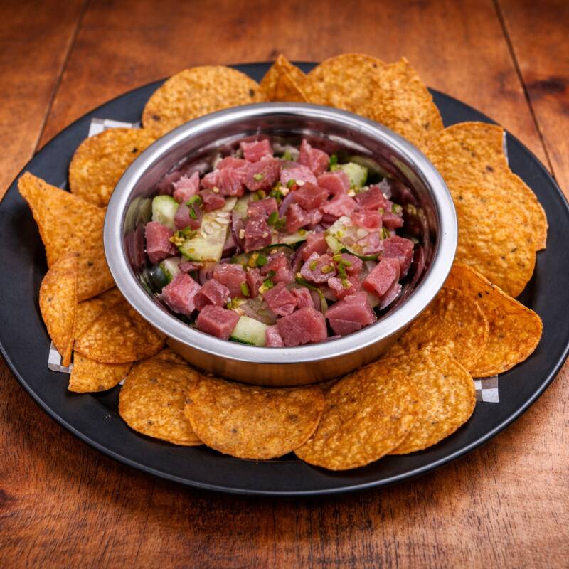 Tostitos con atun fresco, pepino, cebolla y salsa de la casa con chile serrano.
