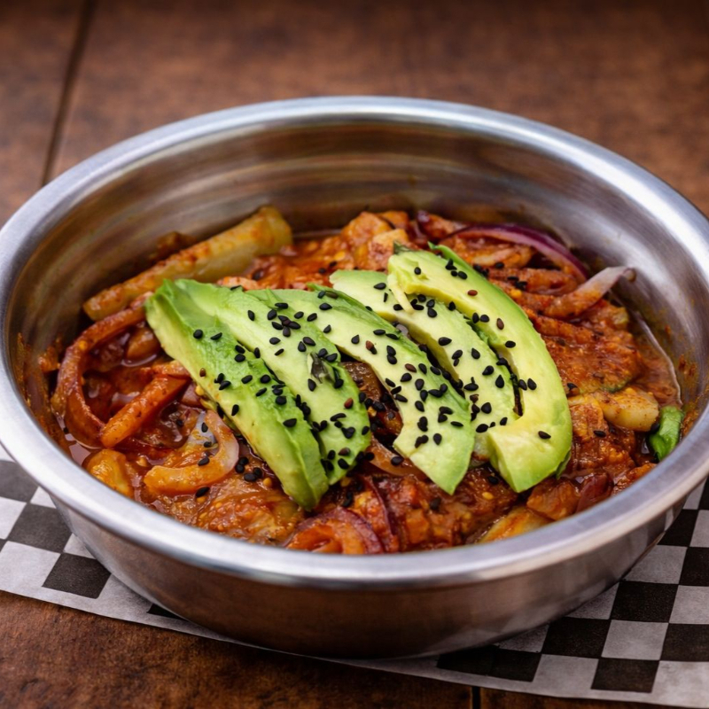 Tortilla de harina con pulpo guisado con salsas negras y cebolla morada