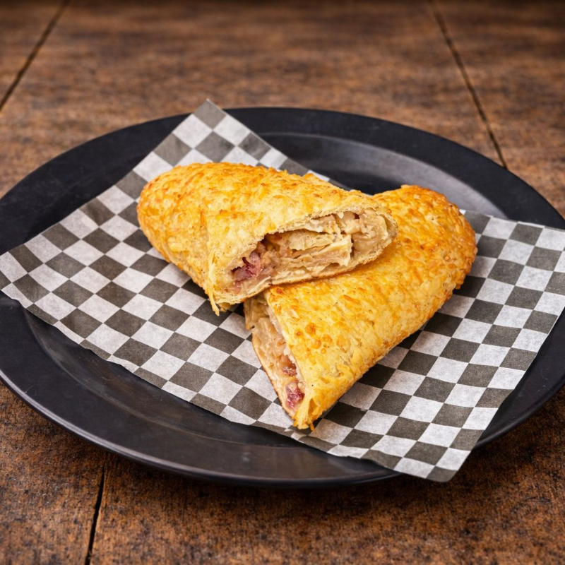 Rollo de masa horneada relleno de pollo, queso y tocino ahumado.