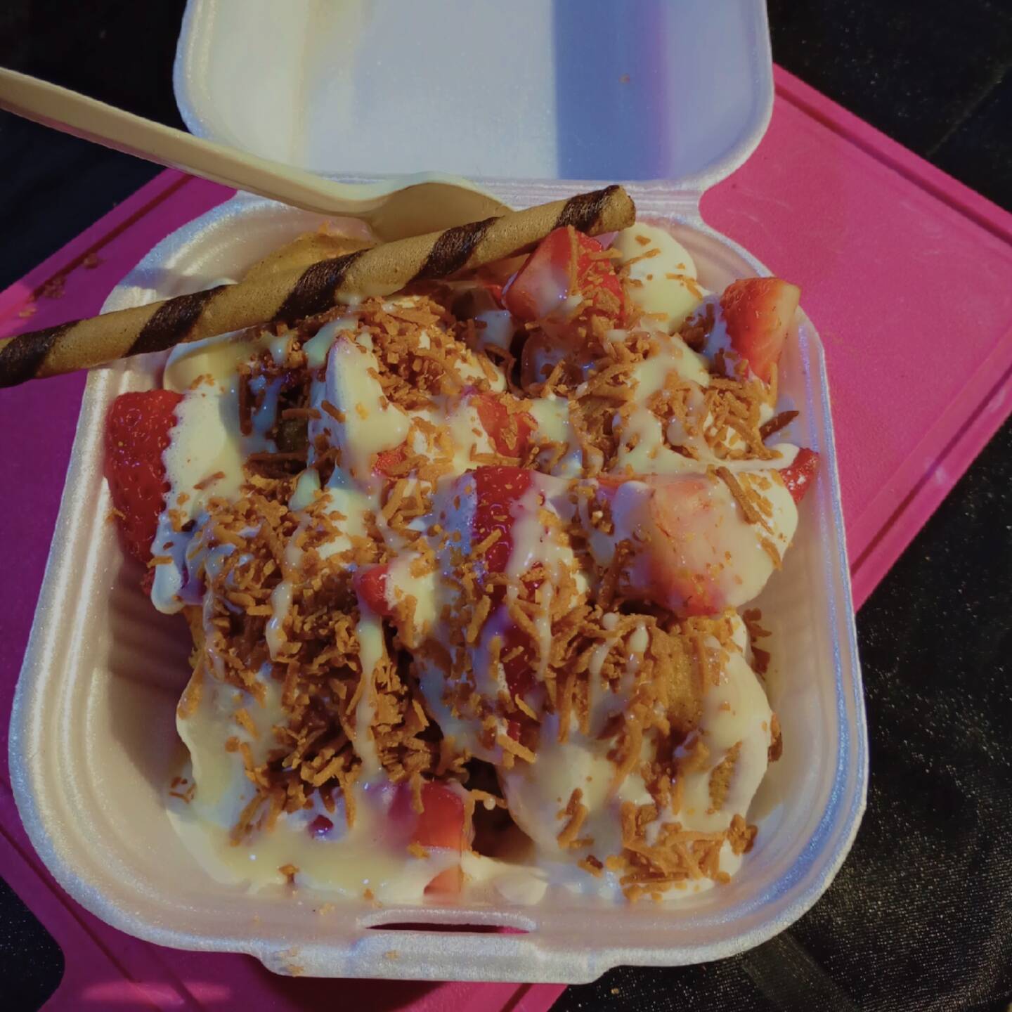 8 donitas de canela bañadas con nuestra crema especial, fresas toppings y jarabes a elegir y waffer de chocolate