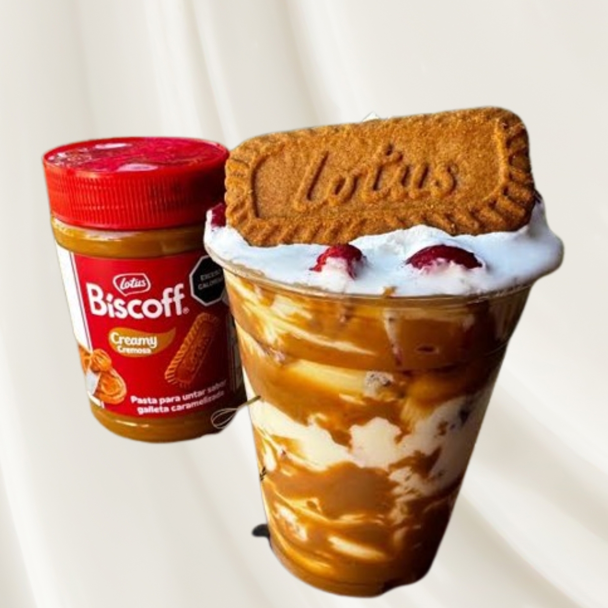 Vaso de 14oz con fresas frescas y crema de la casa, acompañada con rica crema de Lotus y espolvoreada con deliciosa galleta biscoff