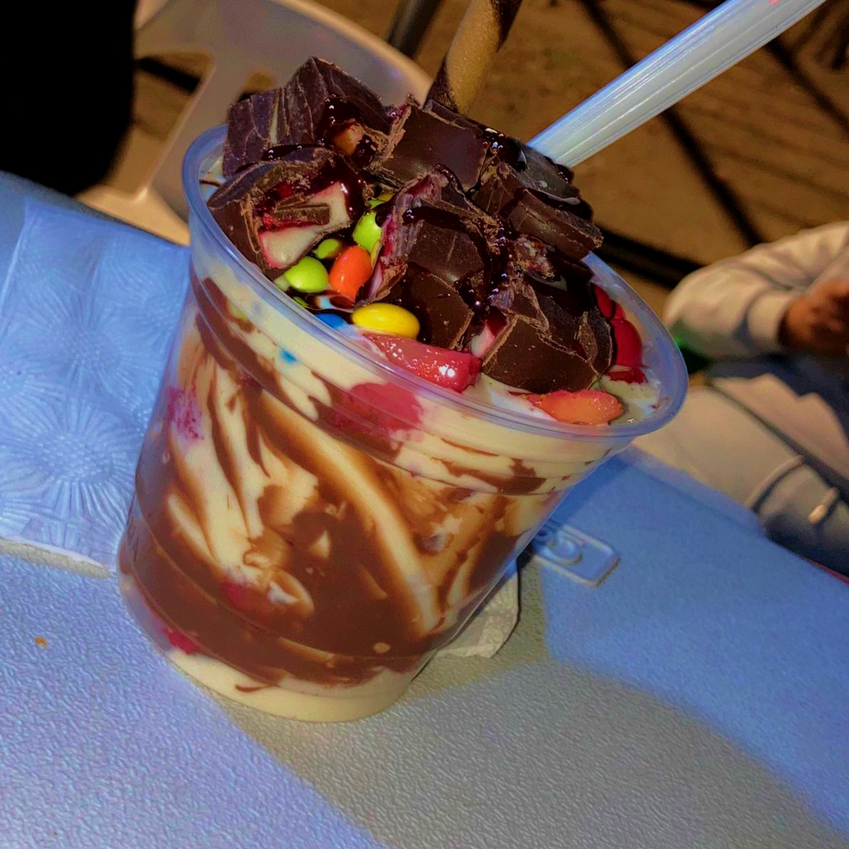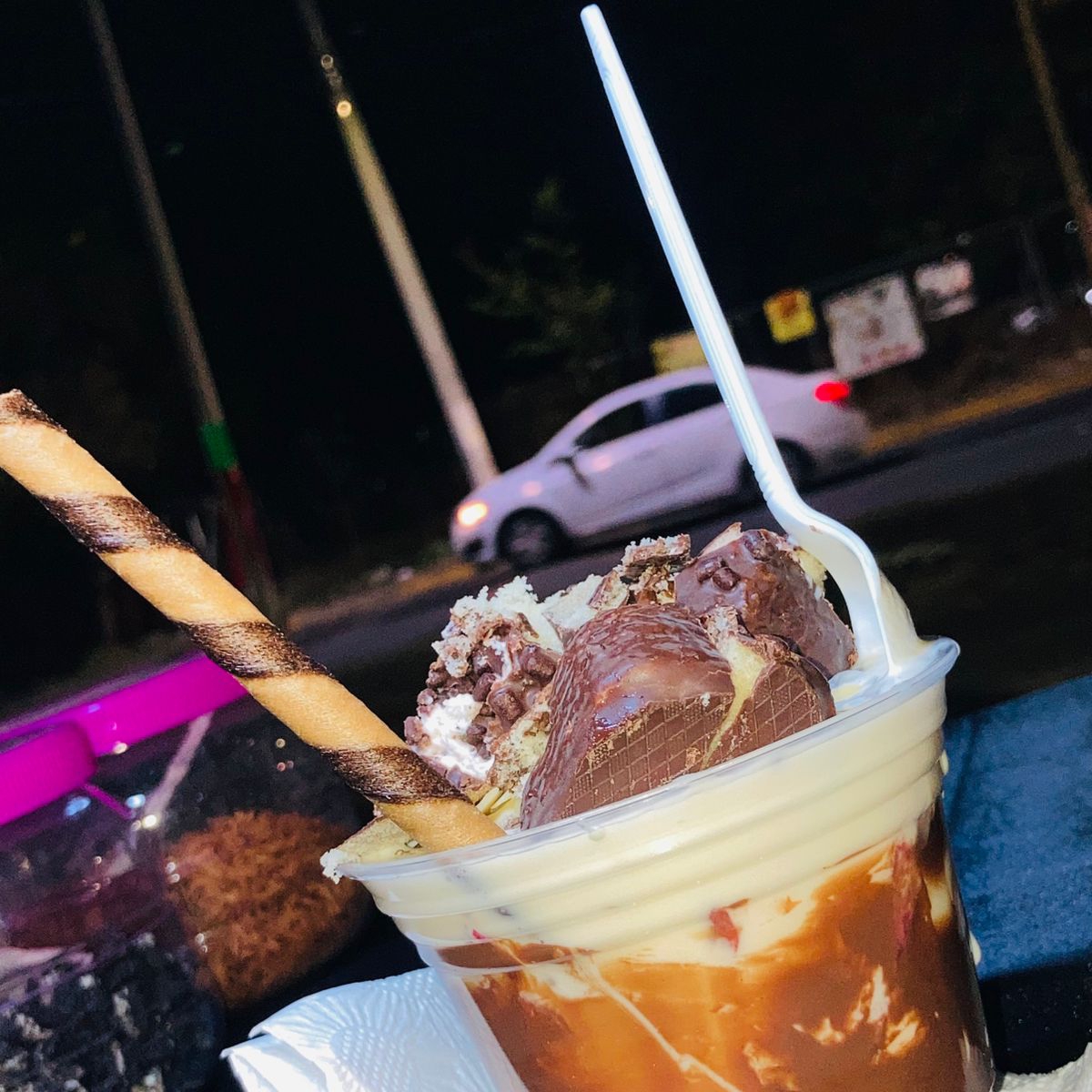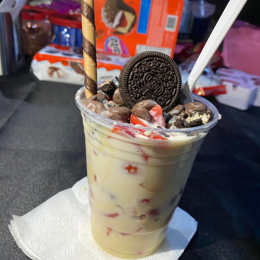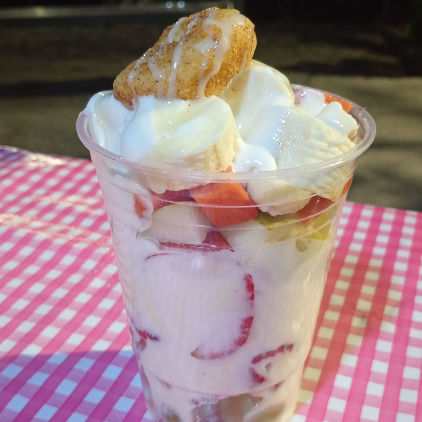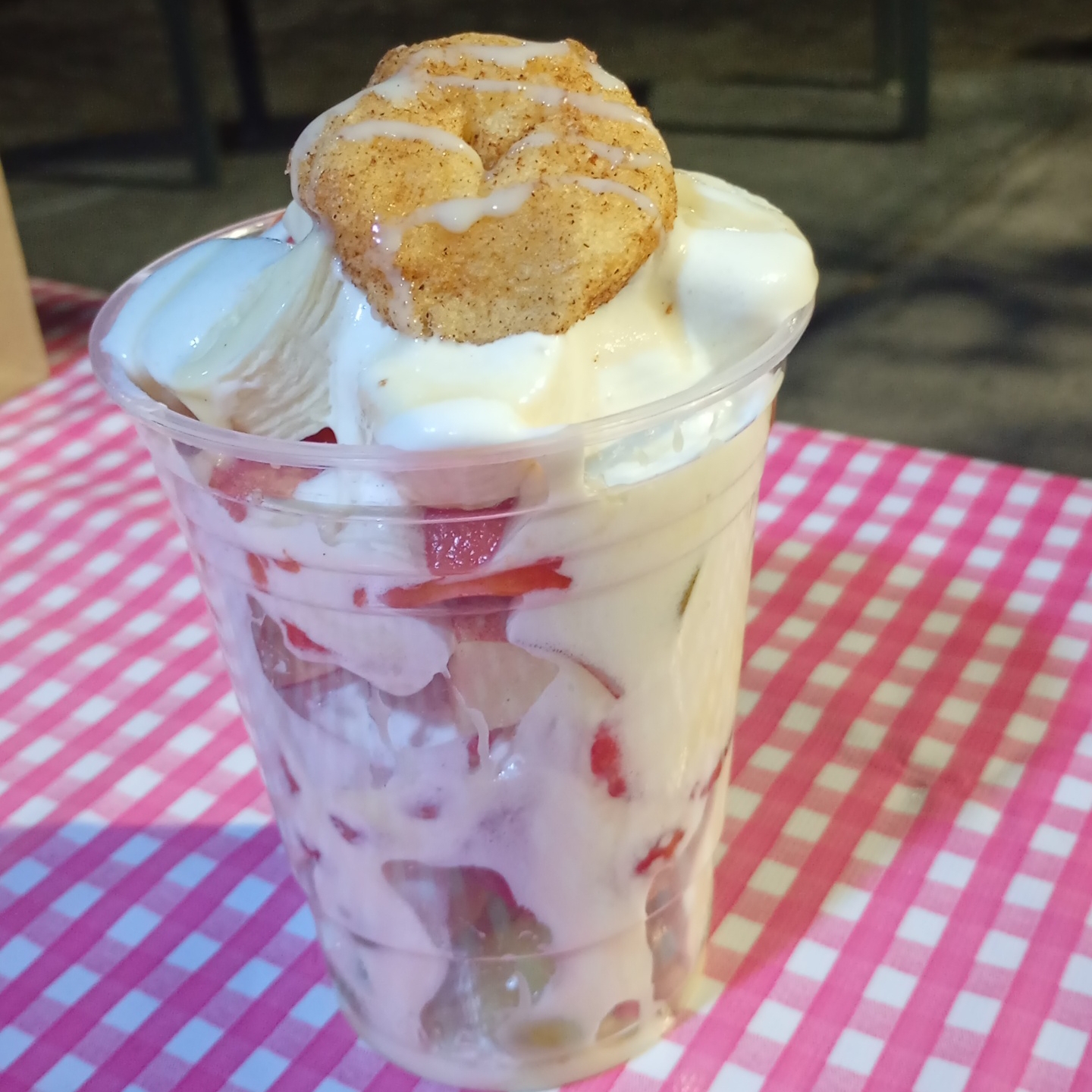 Vaso de 14oz con la fruta de tu preferencia, crema especial, toppings y jarabes a elegir y waffer de chocolate